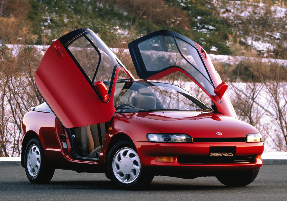 Еще одним обладателем необычных дверей является компактная Toyota Sera – машина, которой обязан даже непревзойденный McLaren F1. Несколько подобных купе есть и в нашей стране, но увидеть «Серу» в Японии шансов гораздо больше. Особо выдающейся динамики от переднеприводного автомобиля с полуторалитровым двигателем мощностью 75 или 110 сил ждать не приходится, но выглядит Sera и по сей день очень эффектно.