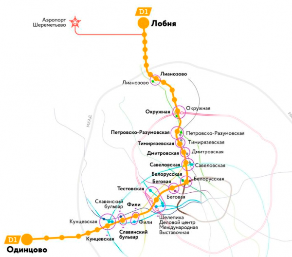 Московские центральные диаметры МЦД — 1 «Белорусско — Савельевский» (Одинцово — Лобня) 52 километра 28 станций 12 пересадочных станций на метро, МЦК и радиальные направления ж/д