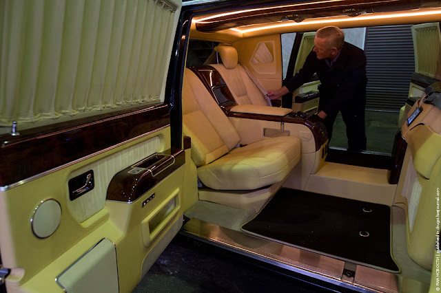 Убранство автомобиля выделяется высоким качеством отделки — обивка сделана из кожи молодых бычков. Салон оборудован, специальными столиками для удобной работы в пути и дополнительными сиденьями для гостей. Задние двери лимузина открываются против движения, с целью обеспечения высокого уровня комфорта и безопасности пассажиров.