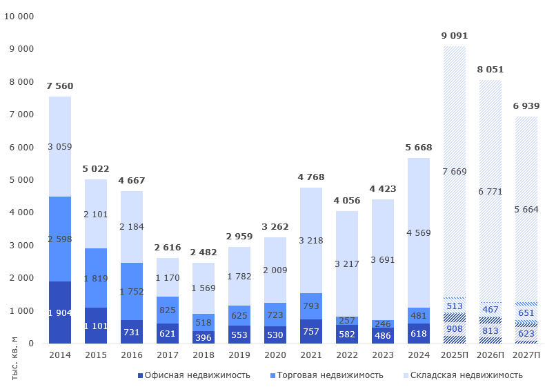 По прогнозам Nikoliers, показатель ввода коммерческой недвижимости в 2026-2027 гг. также останется высоким, однако немного снизится по сравнению с 2025 годом и составит около 8,1 млн кв. м в 2026 году. Наибольшая доля ввода вновь придется на складской сегмент.