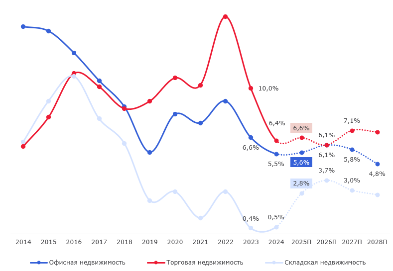 Вакансия в офисном сегменте за год незначительно выросла на 0,1 п.п – с 5,5% в 2024 году до 5,6% в 2025 году. В ритейле увеличение вакансии составило 0,2 п.п – с 6,4% до 6,6%. По прогнозам Nikoliers, в 2026-2028 гг. среднегодовая динамика уровня вакантности по всем сегментам не превысит 1 п.п.