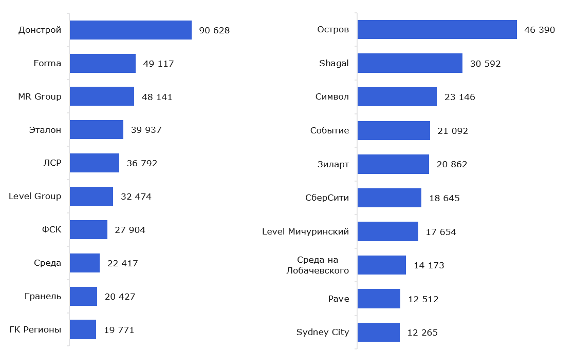 Рейтинг наиболее продаваемых объектов недвижимости почти единолично заняли проекты застройщика «ПИК», включая первые пять строк топа. При этом первое место по объему продаж занял ЖК «Москворечье» (32,0 тыс. кв. м). На шестой строчке рейтинга проект девелопера «Самолет» — ЖК «Молжаниново» (24,2 тыс. кв. м). 8-е и 9-е строки заняли проекты City Bay (20,2 тыс. кв. м) от MR Group и «Be Luck Коломенское» (19,5 тыс. кв. м) от ГК «Гранель».