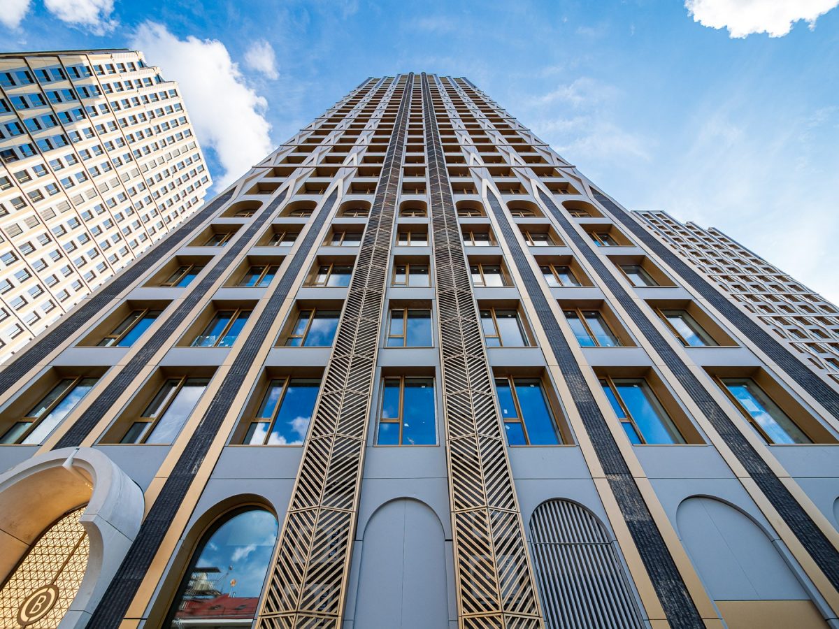 Архитектурный облик проекта, разработанный бюро GAFA, отличается узнаваемой эстетикой стиля ар-деко. Башни со ступенчатым силуэтом визуально разделены на несколько поясов: архитектурные формы становятся проще с понижением этажа, а фактуры отделочных материалов – сложнее. Так, нижняя часть зданий, на уровне взгляда пешеходов, облицована рифлеными плитами из натурального камня в сочетании со сверкающими на солнце металлическими панелями. А идеальные изгибы арочных элементов – сводов козырьков над входными группами и окон – подчеркнуты строгостью прямых линий.