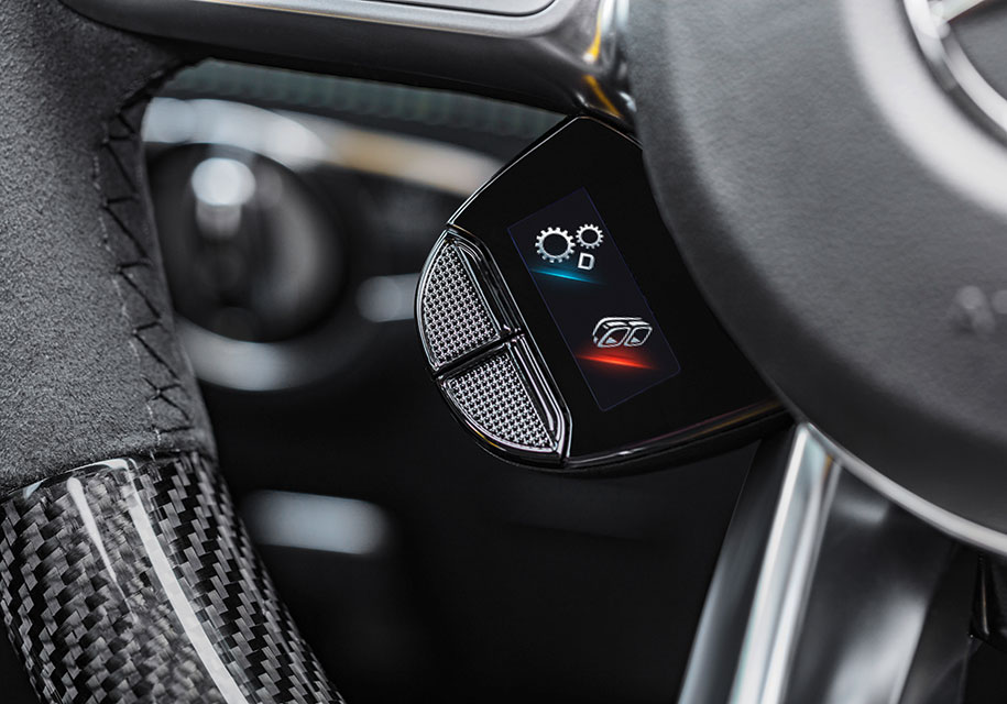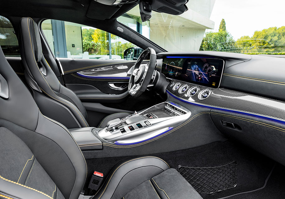 В перечень доступного для Mercedes-AMG GT оборудования входят карбоновые тормоза, цифровая приборная панель, система изменения режимов работы управляющей электроники и записи телеметрии, новый руль с сенсорными панелями и встроенными экранами, встроенные в клавиши экраны на центральной консоли, а также система частичного автономного управления.