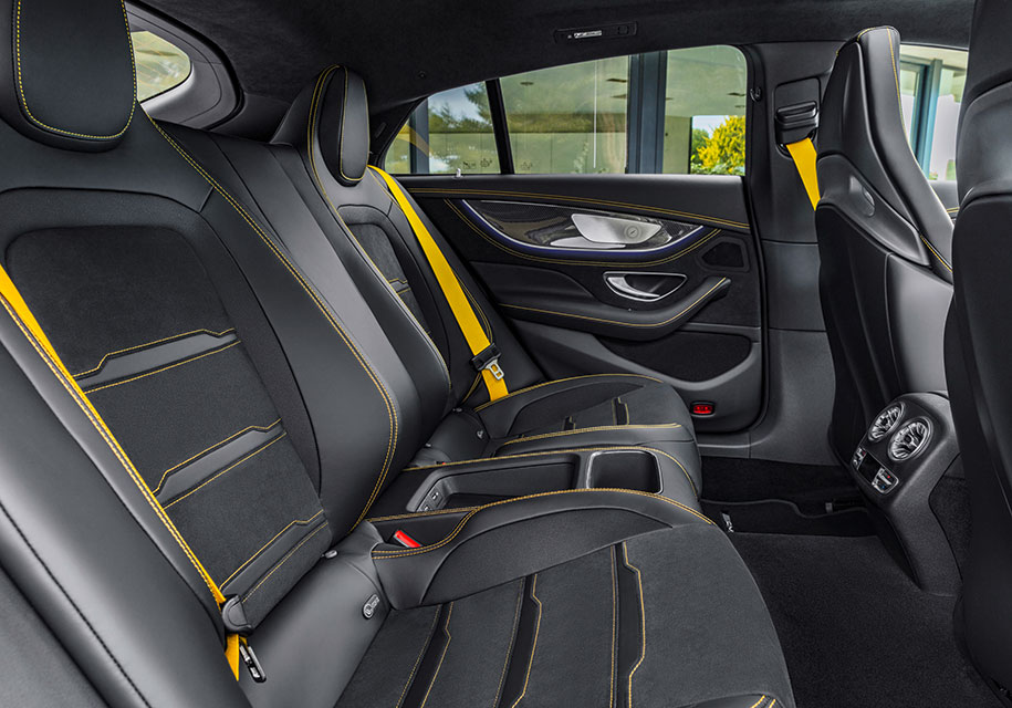Модель можно будет заказать как с пятью, так и с четырьмя посадочными местами (сзади установят два отдельных кресла). Объем багажного отсека Mercedes-AMG GT составляет 395 литров. Еще 60 литров находятся под фальшполом. Если спинки второго ряда сложить, то объем полезного пространства увеличится до 1324 литров. Пятая дверь новинки оснащена электроприводом. Его можно активировать, проведя ногой рядом с датчиком, установленным под бампером.