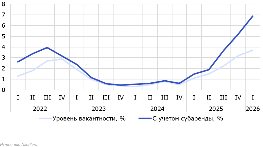 Динамика уровня вакантных готовых площадей с и без учета предложения в субаренду