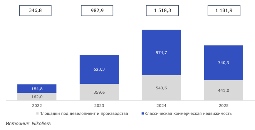 Следующее изображение Сумма инвестиций в коммерческую недвижимость и земельные участки России, млрд рублей.