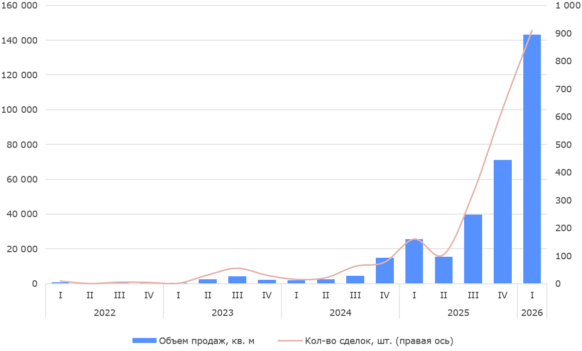 Отметим, что в ключевых деловых районах объем сделок по покупке готовых и строящихся офисных площадей в первые три месяца 2026 г. составил 120 тыс. кв. м, из которых около 49% (59 тыс. кв. м) пришлось на готовые объекты. Средневзвешенная цена продажи готовых офисных помещений достигла 6 442 USD/кв. м (+20% г/г.). На фоне дефицита качественного предложения и роста арендных ставок усилилась активность конечных пользователей — компаний, приобретающих офисные помещения для собственного размещения.