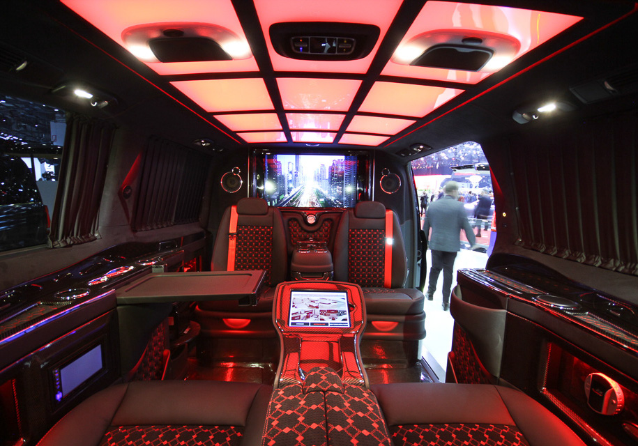 Тюнер из Турции Dizayn VIP привез в Женеву линейку Mercedes-Benz V-Class с очень роскошными интерьерами. Внутри таких машин есть все: кожаные кресла, много экранов, телевизоры, мультимедийная система и атмосферная подвеска, а их кузов снаружи может быть затянут матовой пленкой (что весьма обычно) или даже флоком (что выглядит очень впечатляюще).