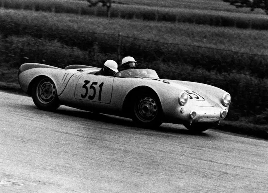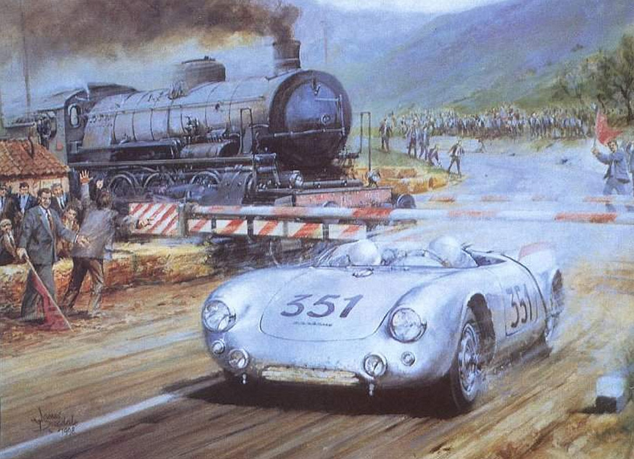 Еще одна история, ставшая настоящей легендой в автоспортивных кругах: в 1954 году автомобили Porsche 550 Spyder принимали участие в классической гонке Mille Miglia, а за рулем машины с бортовым номером 351 выступал пилот Формулы 1 Ханс Херрманн. Один из участков знаменитого марафона близ Брешии пролегал через железнодорожные пути, поэтому перед штурманами стояла ответственная задача – рассчитать все так, чтобы ни в коем случае не «упереться» в проезжающие поезда. И, по воле случая, именно это произошло с экипажем Херрманна – когда серебристый Porsche подъезжал к переезду, шлагбаум уже был опущен, а с правой стороны на всех парах приближался состав. Поскольку Херрманн не желал терять драгоценные секунды (да и места для оттормаживания особо не оставалось), он в приказном порядке сказал штурману пригнуться и… проскочил закрытый переезд под шлагбаумом, в нескольких метрах от гудящего локомотива. Как «Форсаж», только в реальной жизни. Рисунок, кстати, тоже не лишен голливудского пафоса – на самом деле все выглядело менее драматично.
