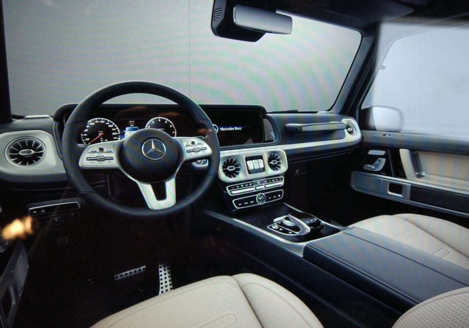 В черной-черной комнате стоит черный-черный… Ну, не гроб, но большая угловатая штуковина на колесах, причем тоже черных-пречерных. Автомобиль по крышу закутан в обсидиановую камуфляжную пленку, а весь свет направлен на белый-белый интерьер – главную гордость создателей G-класса второго поколения.