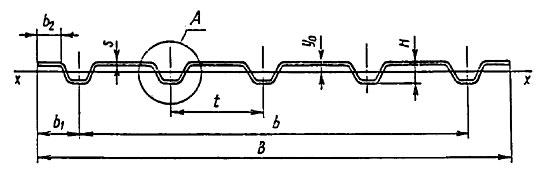 6. Прогиб профилей в поперечном направлении, измеряемый между крайними гофрами, для профилей толщиной до 2 мм не нормируется, а для профилей толщиной более 2 мм не должен превышать 1,5 % ширины профиля.