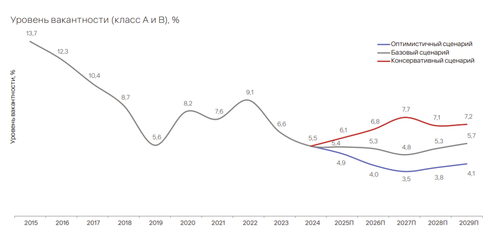 При этом вне зависимости от прогнозного сценария ставки аренды будут увеличиваться, отличаясь лишь темпами роста. Существенным остается и территориальный аспект: спрос на объекты, расположенные в центральных локациях, в перспективе до 2029 г. будет только усиливаться, опережая интерес к офисной недвижимости в локациях от ТТК до МКАД, а уровень ставок внутри ТТК в среднем будет выше на 27-30% по сравнению с объектами внутри МКАД.