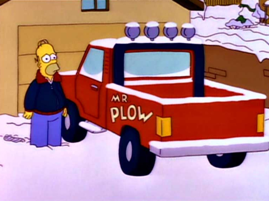 Один из успешнейших бизнес-проектов Гомера – покупка пикапа со снегоуборочным отвалом, благодаря которому Симпсон стал героем в своем городе. Случилось это в 9 серии 4 сезона. Однозначной точки зрения насчет того, какой автомобиль послужил прообразом Mr. Plow, не существует, однако фанаты пикапов Ford настаивают, что Гомер работал именно на машине с голубым овалом – теоретически, на Ford F-250. Что касается машины конкурента Гомера, Plow King Барни Гамбла, то он, вероятно, списан с Ford F-650.