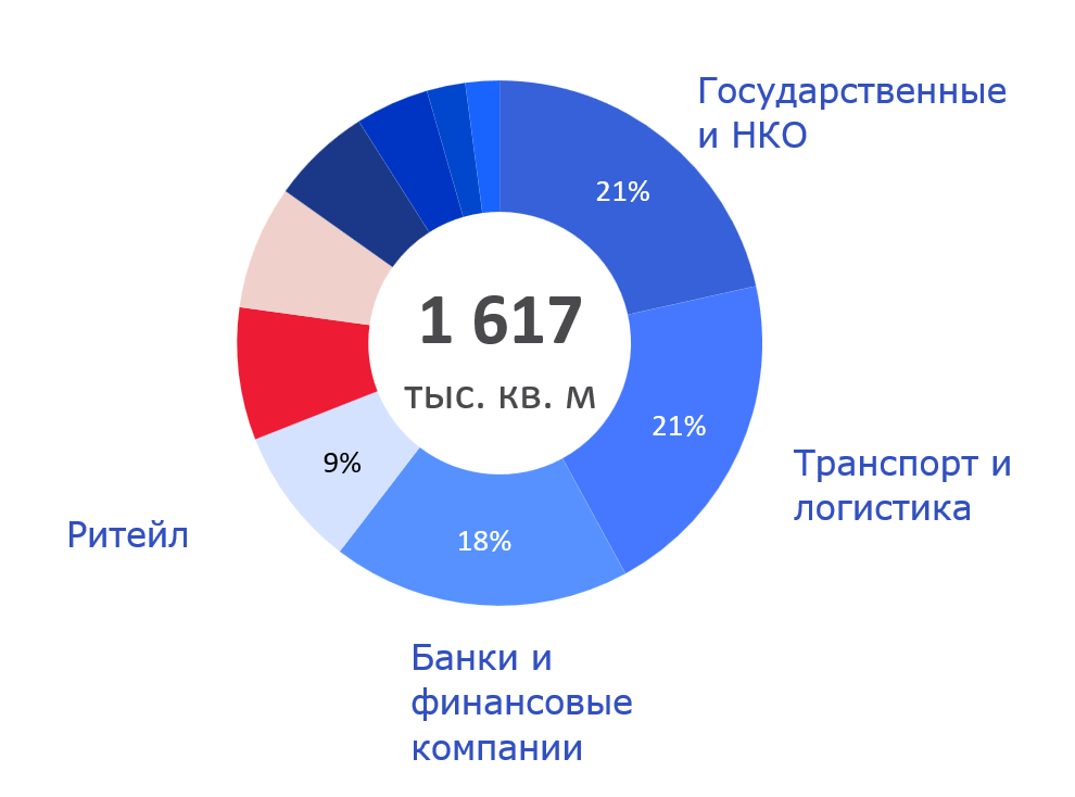 В период с 2020 до 2023 г. наиболее активными драйверами спроса выступали банки и финансовые компании – они формировали 27% от общего объема сделок по аренде и продаже штаб-квартир, на втором месте – IT и Телекоммуникации (17%), далее следуют компании сектора «производство» (11%) и «транспорт и логистика» (10%). При этом с 2024 г., который был абсолютно рекордным по объему сделок, структура спроса изменилась, более того, этот период был отмечен крупными сделками по площади офисов. Так, за период 2024 – III кв. 2025 гг. лидерами стали государственные структуры и НКО, а также «транспорт и логистика» – они сформировали по 31% и 27% от общего объема сделок по штаб-квартирам. Далее следуют банки и финансовые компании (13%), а также компании ритейла — 10%.