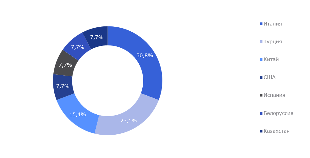 Среди вышедших в этом году на российский рынок иностранных игроков наибольшую активность демонстрировали бренды из Италии (30,8% от общего количества открытий), Турции (23,1%) и Китая (15,4%). Стоит отметить, что в этом году представленность стран стала менее разнообразной. Более того, китайские бренды, которые ранее лидировали по выходу на российский рынок, теперь демонстрируют более сдержанные темпы развития. Так, новые игроки из США, Испании, Беларуси и Казахстана сформировали по 7,7% каждый от общего числа открытий. До конца года анонсирован выход брендов из Ирана, ОАЭ, Узбекистана, Финляндии и Мексики.