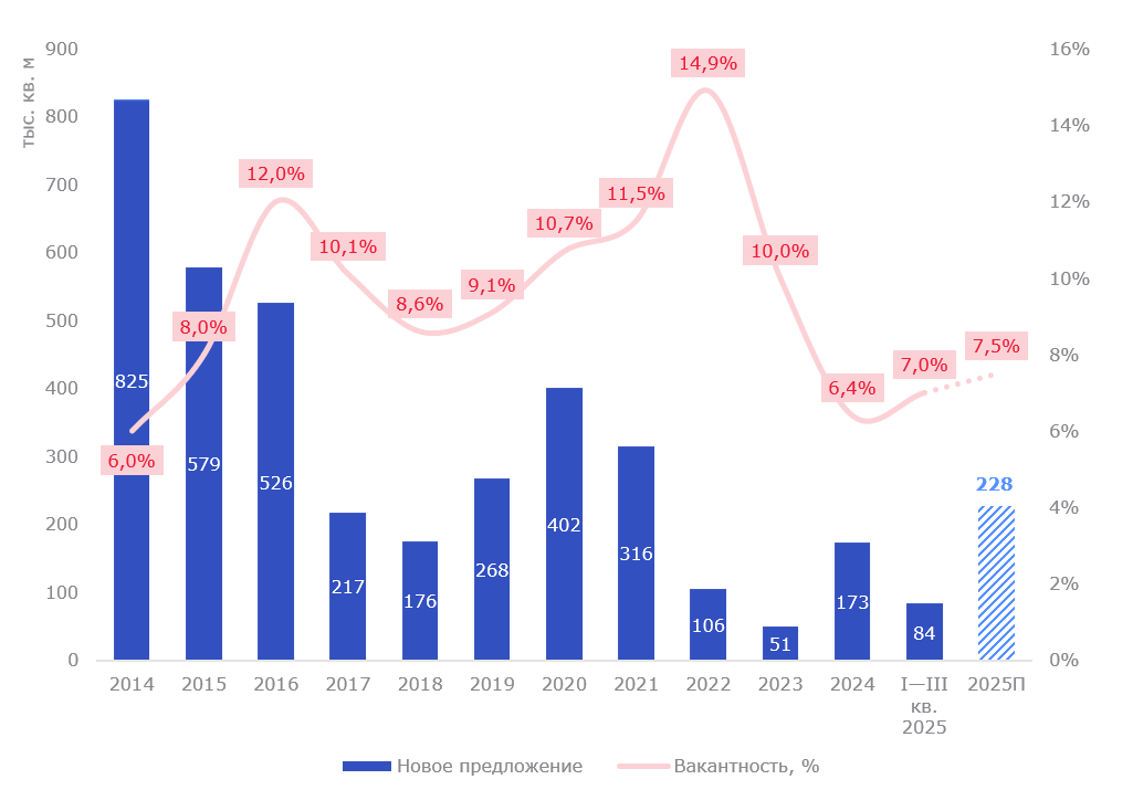 Девелоперская активность в Москве остается умеренной: за девять месяцев 2025 года качественное торговое предложение пополнилось на 84 тыс. кв. м или 9 объектов. Наиболее крупными объектами, открытыми с начала года, стали МФК Botanica Mall в составе ТПУ «Ботанический сад» (GLA 28,5 тыс. кв. м), РЦ «Витязь» (GLA 11,3 тыс. кв. м) от ADG Group и ТЦ «Грис Молл» (GLA 10,9 тыс. кв. м) на севере Москвы. Объем ввода за 9 месяцев 2025 года оказался ниже на треть результата 2024 года, при этом выше на 66% и 45% ввода за 2023 г. и 2022 г. за аналогичный период. Всего в 2025 г. ожидается открытие 16 торговых центров на 228 тыс. кв. м. Таким образом, новое строительство по итогам 2025 года может приблизиться к показателю докризисного 2021 года.