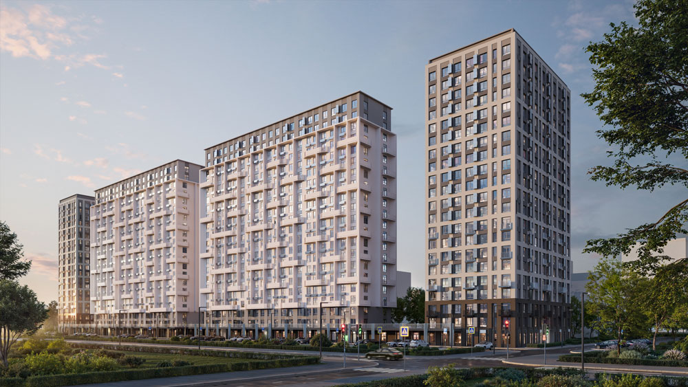 При выборе фасадного решения комплекса его создатели – девелопер проекта группа «Самолет» и архитектурное бюро Zarya – выбрали концепцию легкости пространства, а в качестве цветовых и объемных референсов – сочетание холодной водной стихии и камня, легкость и ажурность кружева, сложную природную игру оттенков перламутра. Колористическое решение выполнено по принципу градации цвета по высотности объемов – чем больше, тем светлее. Самые массивные части здания окрашены в белый — он становится идеальным фоном для игры света и тени. По тому же принципу нижние объемы были выделены темными цветами, чтобы визуально подчеркнуть основание здания. Геометрические формы балконов, выступающие из плоскости фасада, отбрасывают выразительные тени на здание, формируя живые узоры, меняющиеся в зависимости от положения солнца и времени суток.