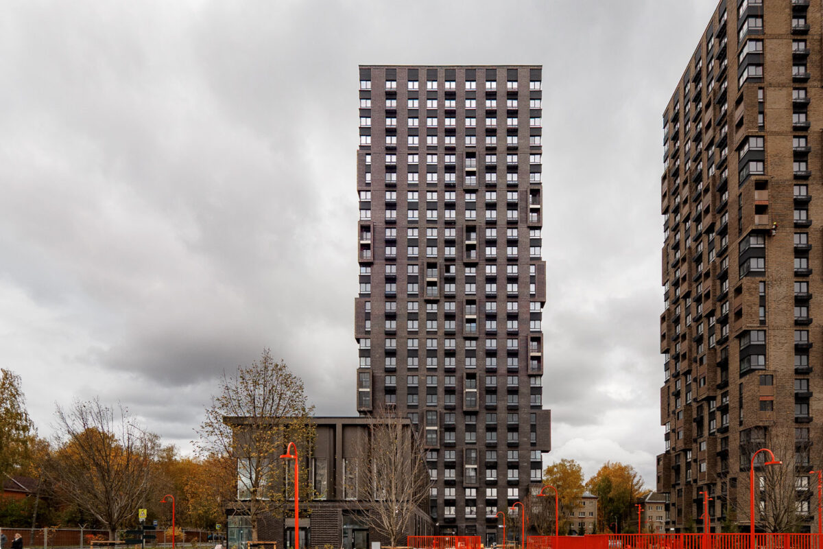 Фасады корпусов выполнены из фактурной и гладкой кирпичной кладки в природном градиенте: от бежевого с темными вкраплениями до красно-коричневого. Балконы с витражным остеклением расположены на разных уровнях. Это придает динамику фасаду и помогает избежать монотонности. Места общего пользования оформлены в минималистичном стиле с терракотовыми цветовыми акцентами и черными деталями. Пространства украшены живыми растениями. Для комфорта жителей на первом этаже предусмотрены места для ожидания и просторные помещения для хранения колясок и велосипедов.
