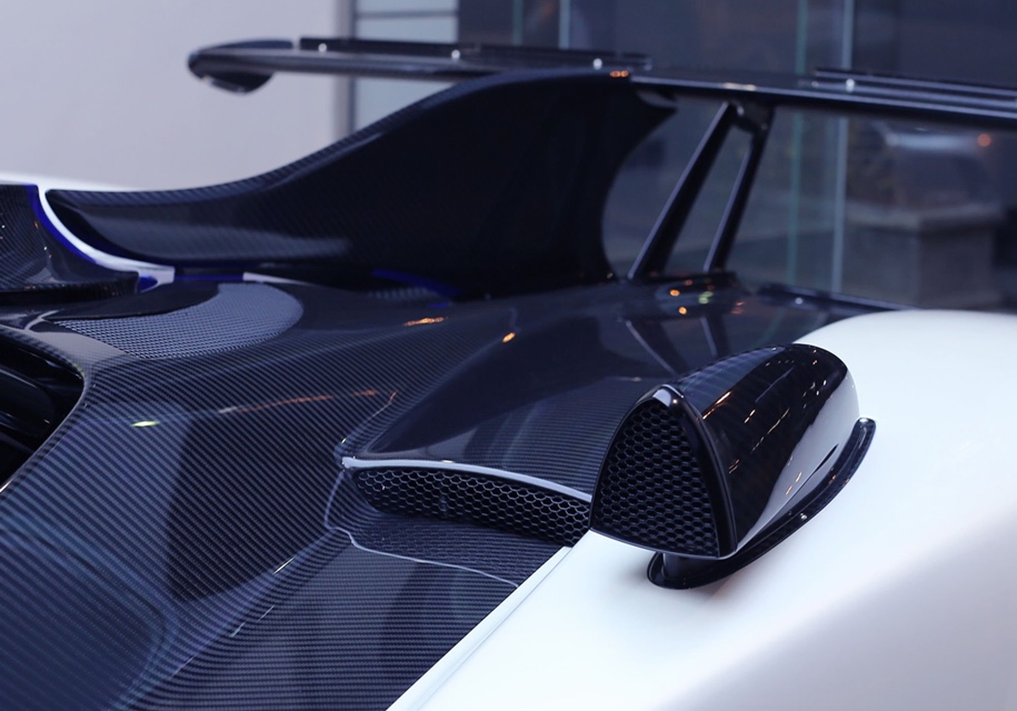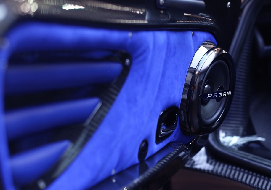 В отделке интерьера используется кожа, синяя алькантара, углеродное волокно и алюминий.