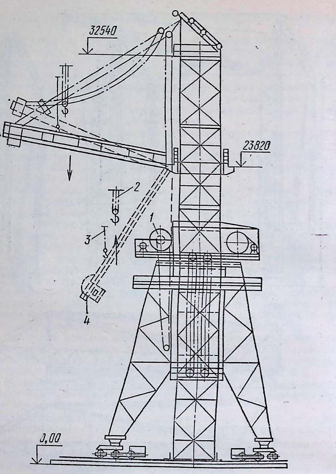 Рис, 10. Начало монтажа башенного крана БК-1000: 7 — монтажная лебедка; 2 — механизм главного подъема монтажного стрелового крана; 3— механизм вспомогательного подъема стрелового крана; 4 — консоль противовеса крана БК-1000