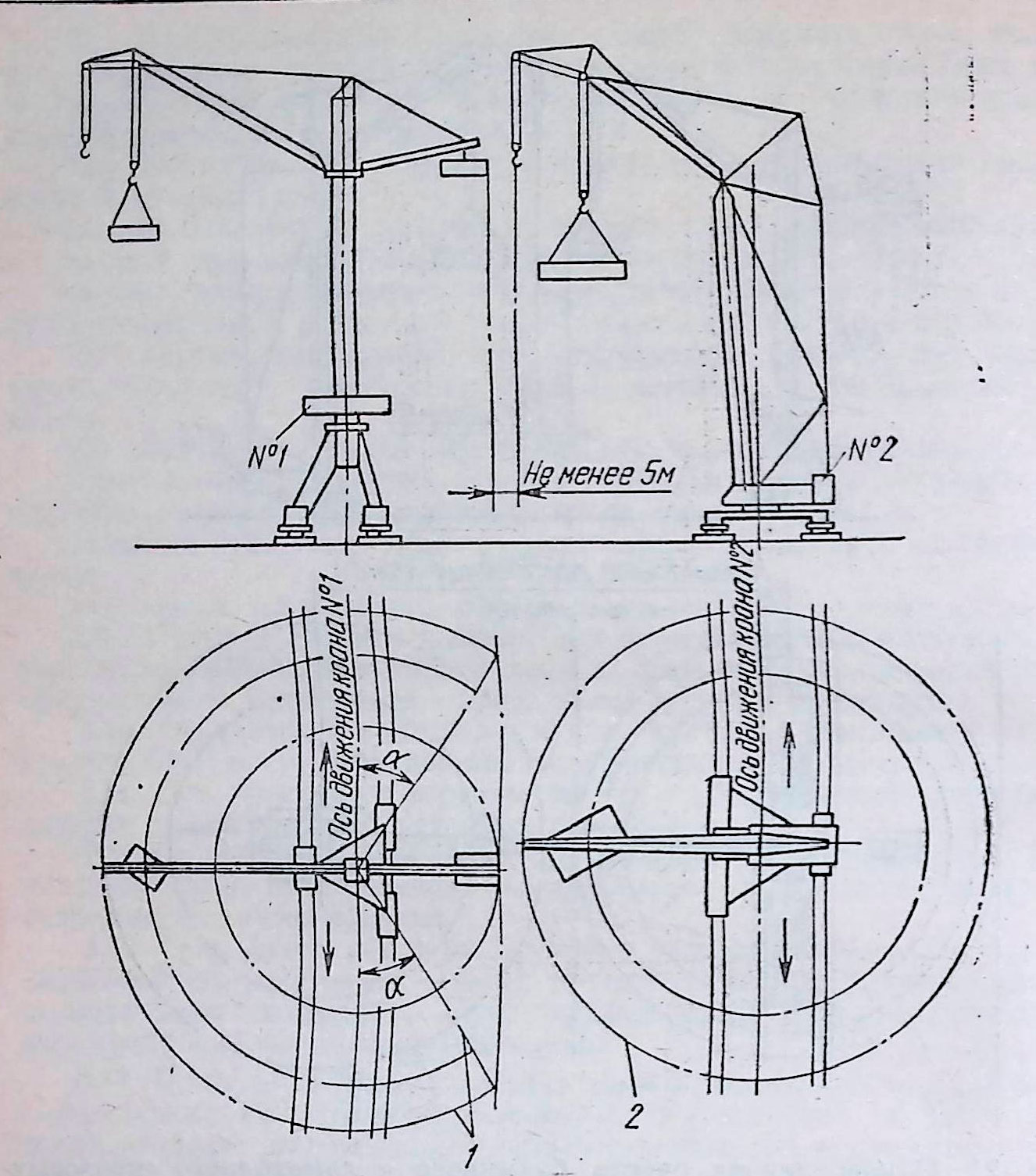 Рис. 24. Одновременная работа двух башенных кранов на параллельных путях в полноповоротном режиме при их предельном сближении: