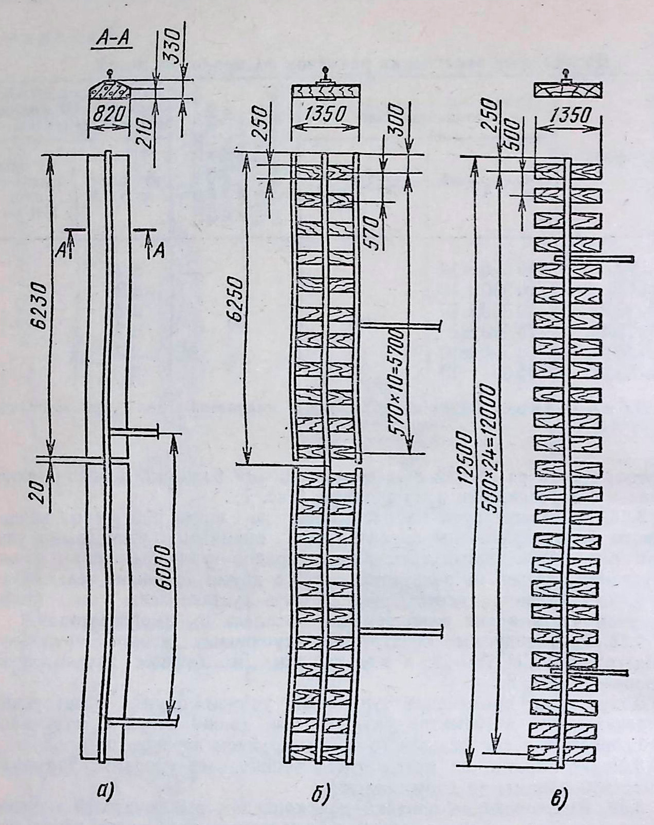 а — с железобетонными балками: б — деревометаллические; в — с деревянными полушпалами
