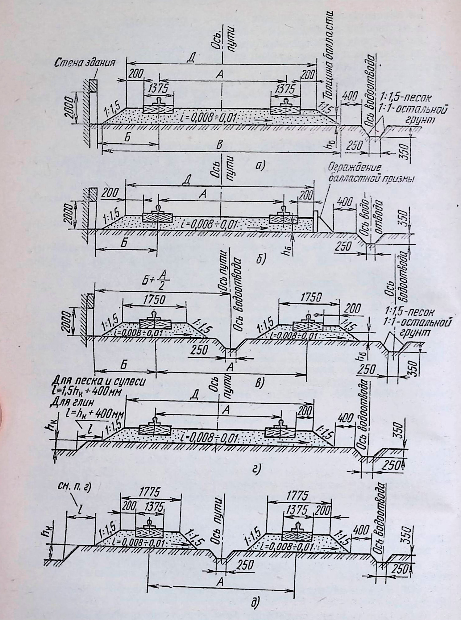 а — при ширине колеи не более 4000 мм; б — при ширине колен не более 4000мм; , — б°ковым ограждением балластной призмы; «—при ширине колен не ‘. ее 4000 мм; г — при ширине колен не более 4000 мм п.1 пути у откоса кот. о.-.о при ширине колен более 4000 мм на пути у откоса котлован.’.: .1 — колеи; Ь минимальное расстояние от выступающей части J’I.’HH- ■.•лее грузов или других предметов до осп первого рельса; В — ширина ос о ■■ ■ Д ширина полотна; Г—расстояние от основания балластной при ,о , — дна котлована; /ц.— глубина котлована; IIQ —толщина балласта под ‘