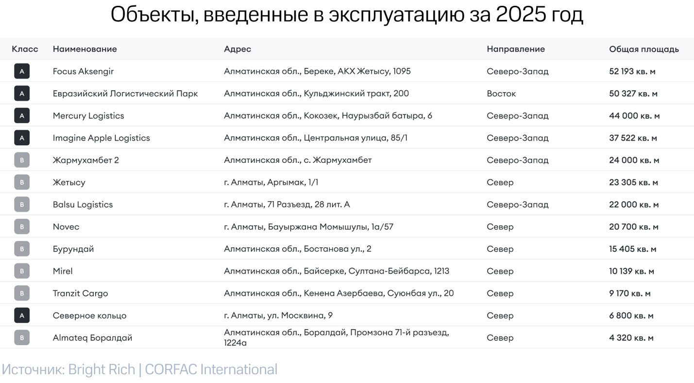 В 2025 году в Алматы и Алматинской области было построено 320 тыс. кв. м складской недвижимости, что стало самым высоким показателем за все время, подсчитали в Bright Rich | CORFAC International. По сравнению с 2024 годом объем ввода площадей на локальном рынке вырос в 3,5 раза.