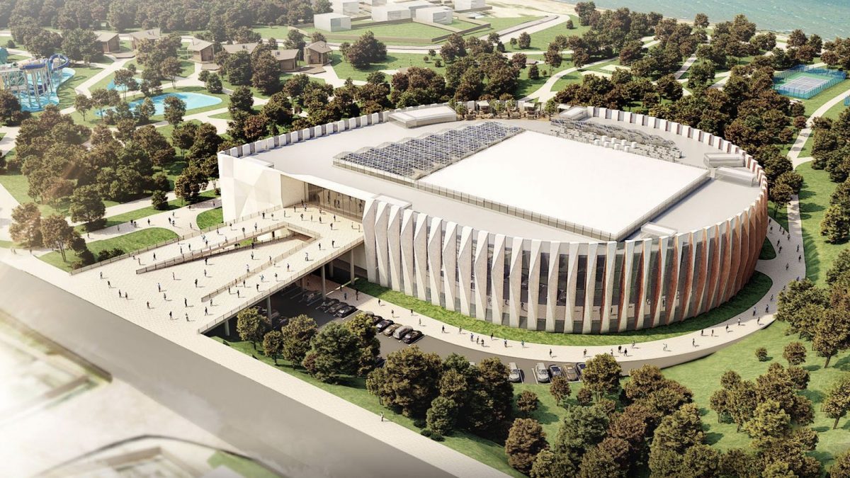 На участке, помимо Дворца спорта, планируется устройство футбольного поля с раздевалками, площадки для баскетбола, волейбола, тенниса и занятий с тренажёрами, а также монтаж инфраструктурных объектов: двух трансформаторных подстанций, дизель-генераторной установки, канализационной насосной станции и других.