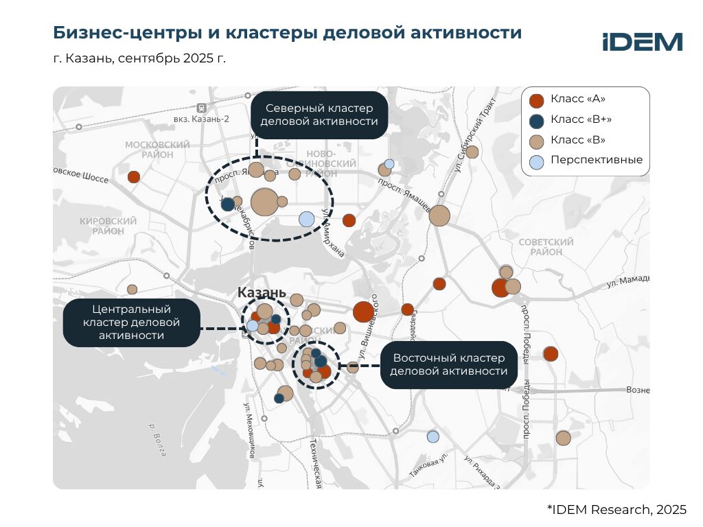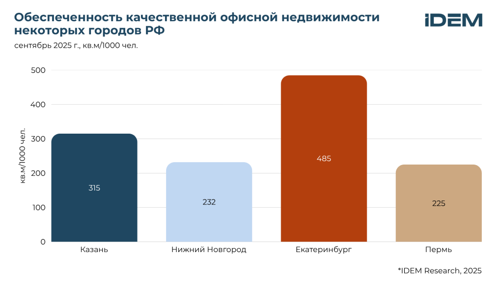 В Казани 55 качественных бизнес-центров классов «А», «B+» и «В», полезная площадь этих объектов 418 тыс. м2. Осенью 2025 года IDEM-консалтинг проанализировали рынок офисной недвижимости города. Уровень обеспеченности офисными площадями в столице Татарстана составляет 315 м2 на 1000 жителей. Для мощных региональных центров, где соответствующая структура экономики и высокая деловая активность, этот показатель может составлять 400–450 м2/1000 человек. Консультанты полагают, что в Казани есть потенциал для строительства еще по меньшей мере 100 тыс. м2 офисных площадей.