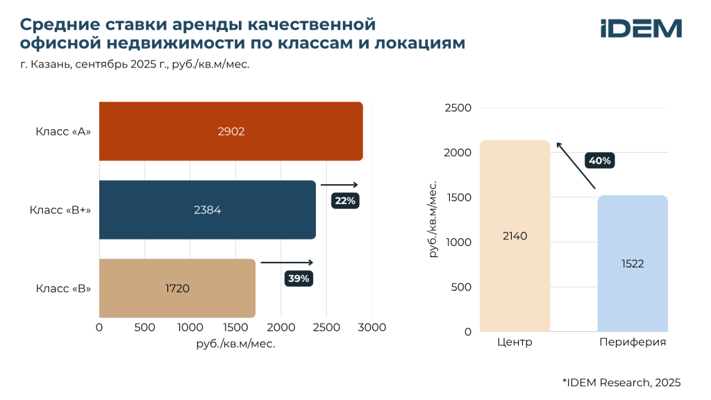 Ставки аренды в Казани выше, чем в соседних регионах, и приближаются к уровню Санкт-Петербурга – до 34,8 тыс. рублей за м2 в год, в зависимости от класса. Разница в стоимости аренды между центральным районом и периферией в столице Татарстана составляет около 40%, что характерно для рынка с центрированной системой.