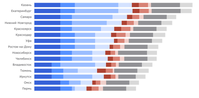 На основе обозначенных критериев были рассчитаны интегральные оценки для 72 городов-административных центров регионов, где уже есть предприятия 20 крупнейших государственных компаний. В результате Nikoliers выделила 15 городов с наивысшими совокупными показателями.