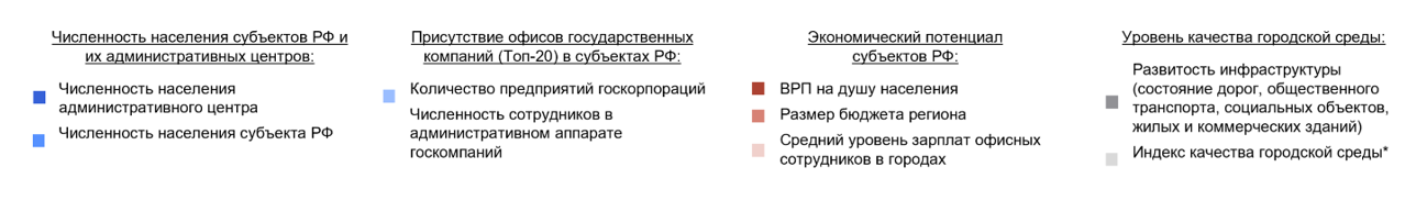 [1] Комплексная оценка производилась по следующим параметрам: численность населения субъектов РФ и их административных центров, присутствие офисов государственных компаний (ТОП-20) в субъектах РФ, экономический потенциал субъектов РФ, уровень качества городской среды.