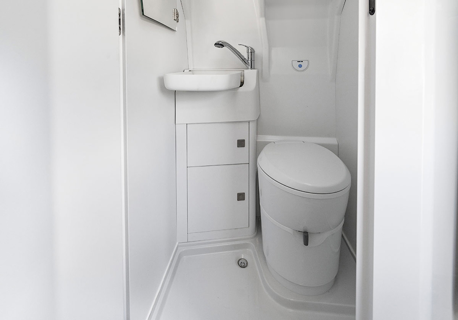 Габаритная длина машины достигает шести метров, а колесная база – 3,6 метра. Высота кабины – 2,2 метра. За передними креслами, которые разворачиваются почти на 180 градусов, расположена обеденная зона со столом. За ней находится ванная комната площадью один квадратный метр: здесь есть туалет, душ и складная раковина.