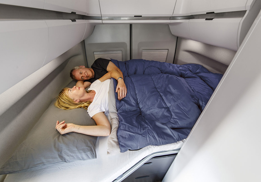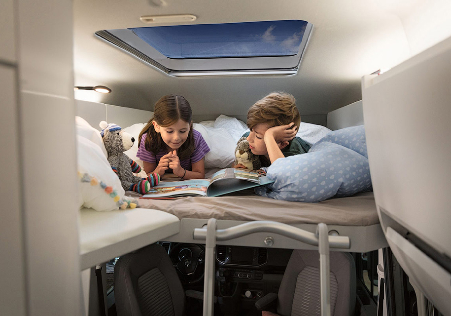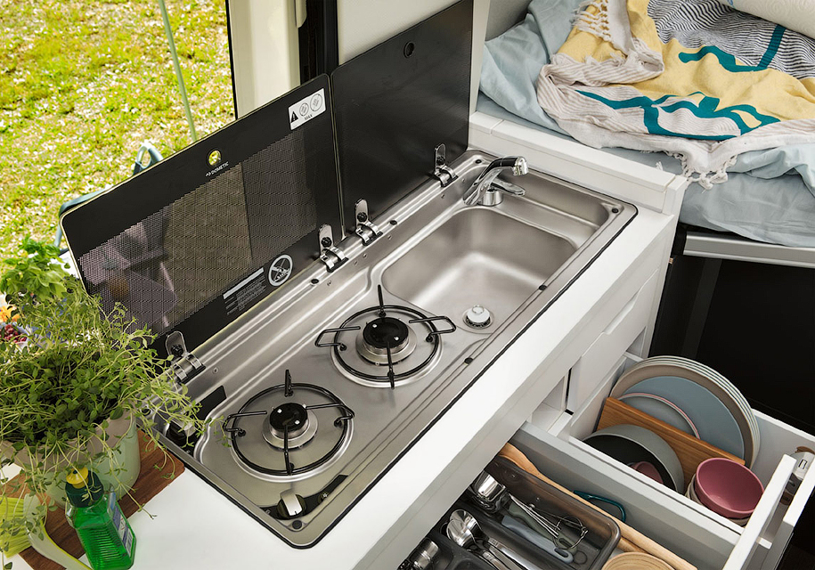 Далее расположена плита с двумя конфорками и раковина. Здесь же есть различные отсеки для вещей и шкафы, а также 70-литровый холодильник. В задней части салона находится большая кровать. В качестве опции будет доступен «второй этаж», где можно разместить еще пару спальных мест. В этом случае высота машины достигнет почти трех метров.