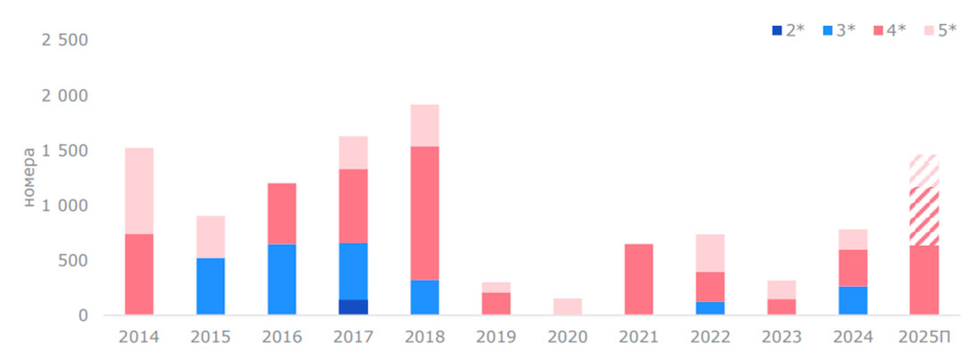 Объем нового гостиничного фонда в Москве по итогам первых шести месяцев 2025 г. составил 635 номеров. За I полугодие 2025 г. на столичном рынке открылась одна четырехзвездочная гостиница в центре Москвы – Palmira Art Hotel (225 номеров). Также расширился портфель крупного российского гостиничного оператора Azimut Hotels, под его управлением с марта 2025 года теперь находится «AZIMUT Отель Аэростар Москва» 4*. До конца года к вводу заявлены еще пять гостиниц на 820 номеров, четыре в Москве и одна в Орехово-Зуеве.