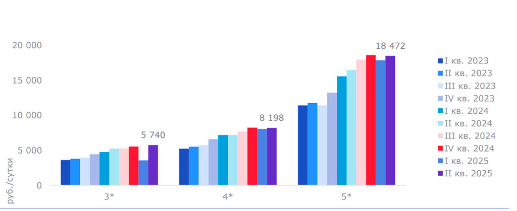 По итогам I полугодия средняя цена номера за сутки в среднем по рынку увеличилась на 12,4%, до 10,4 тыс. руб./сутки. Однако рост наблюдался только в сегментах 4* и 5*, тогда как в 3* отелях ADR снизился на 6,4%. Это стало следствием падения их заполняемости.