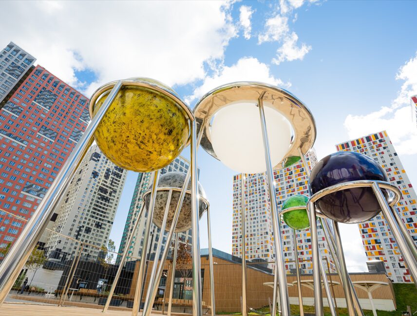 «Живая» инсталляция называется «Парад планет», однако искать в ней астрономическую точность или привязку к конкретным небесным телам нашей Солнечной системы не стоит. Композиция отсылает к бесконечному разнообразию Вселенной, которая объединяет огромный звездно-планетный архипелаг в единую плоскость – точно так же, как новый дом объединяет на своей территории жителей, таких разных по своим характерам и интересам.